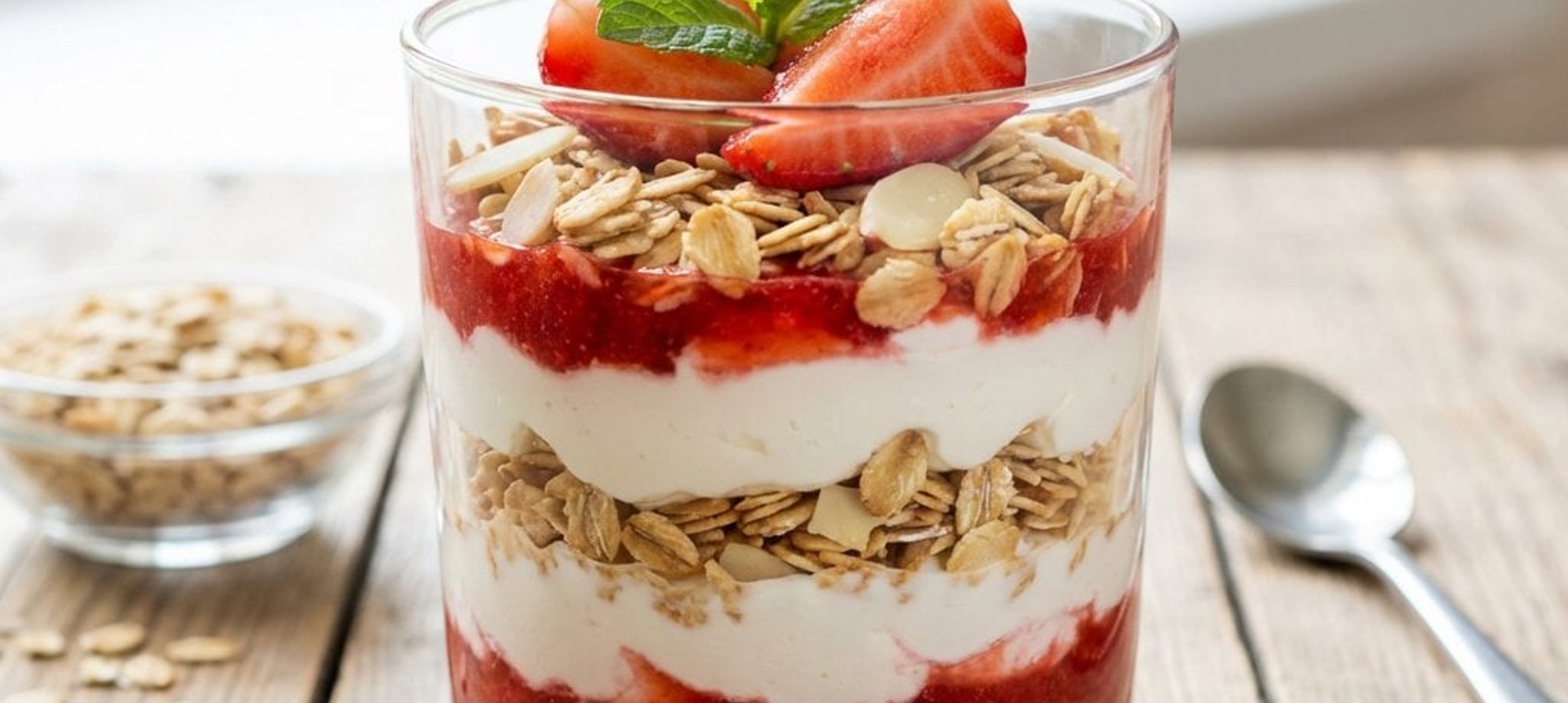 Ez a gyümölcsös parfait kiváló uzsonna. Ha reggelire szeretné fogyasztani, növelje a zabpehely mennyiségét összesen 120 grammra.