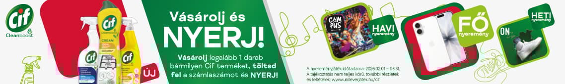 Vásárolj legalább 1 darab bármilyen Cif terméket, töltsd fel a rendelésszámot és nyerd meg az értékes nyeremények egyikét. A nyereményjáték ideje alatt hetente kisorsolunk egy 60.000 Ft értékű ON SIZE sneaker vásárlási utalványt, havonta egy páros Campus fesztivál 2026 bérletet, a főnyeremény pedig egy iPhone 17 okostelefon.