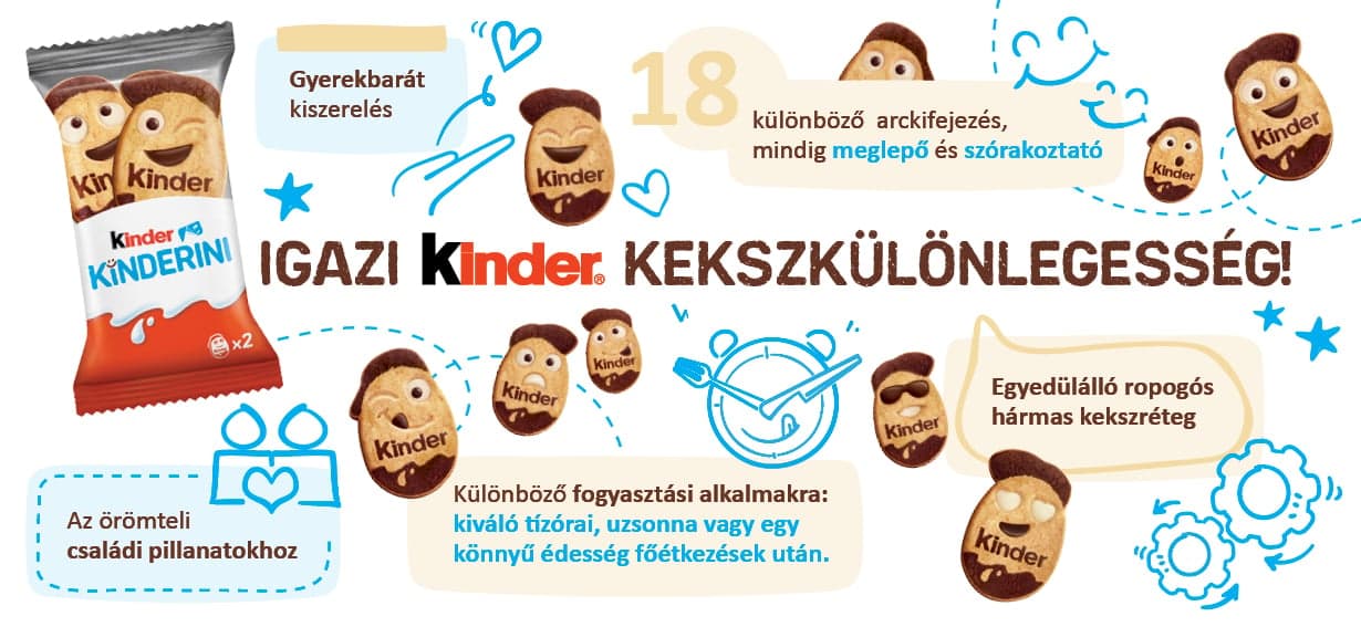 A Kinder Kinderini egy ropogós keksz tejes és kakaós díszítéssel, amely játékos arckifejezéseivel garantáltan mosolyt csal az arcokra. A Kinder minőség biztosíték a gondosan válogatott alapanyagokra és az ízletes élményre, így a Kinderini tökéletes választás reggeli mellé, tízóraira vagy egy kis kényeztetésre a nap bármely szakában.