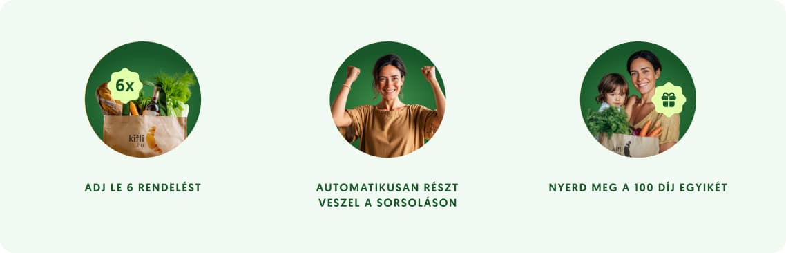 És a legjobb az egészben? Minden rendelésed egy lépéssel közelebb visz egy verhetetlen nyereményhez: egy egész évre szóló ingyenes bevásárlás a 6.000.000 Ft értékű kreditért, plusz 99 másik fantasztikus nyereményért!