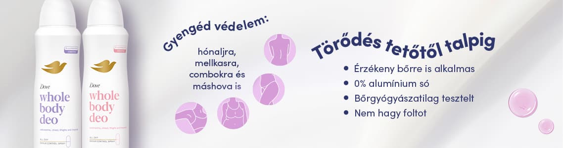A Dove teljes testre való dezodorunk ötvözi mindazt a bőrápolást, amit a Dove-tól elvársz, hatékony, teljes testre kiterjedő szagkontrollal – még az érzékeny területeken is. A szag forrásánál fejti ki hatását, és frissen tart. Amikor azt mondjuk, teljes testre való dezodor, komolyan gondoljuk. Bárhol használhatod*, ahol testszag jelentkezik: a mellek alatt, a combokon, a deréktájon, a lábakon, a hónaljban és azon is túl. Igen, a bőrbarát formulánk bőrgyógyászatilag tesztelt. Ez a láthatatlan dezodor tisztán, csíkmentesen vihető fel, és a kialakítása lehetővé teszi a könnyű, maszatmentes, teljes testre való használatot. Válaszd a számodra megfelelő típusú dezodort málna&rózsa vagy levendula&kamilla illattal.